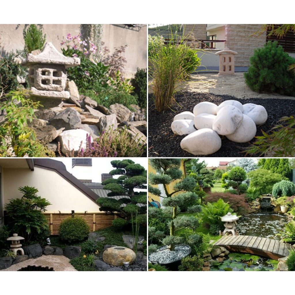 Elementele specifice grădinilor japoneze sunt apa, plantele și pietrele simbolizând viața, natura, pacea. Combinând aceste trei elemente rezultă un spațiu relaxant și armonios, plăcut pe întreaga perioadă a anului.